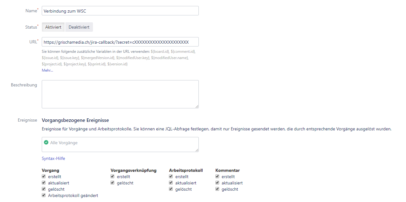 - Hinterlegen Sie die im Zwischenspeicher liegende Callback URL in das Feld URL