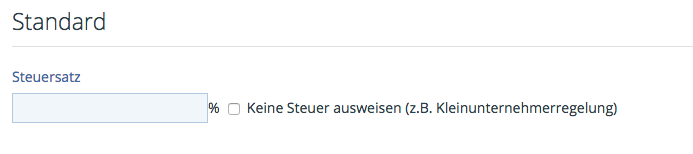 Als Kleinunternehmer sind Sie von der Umsatzsteuer befreit. Erstellen Sie eine neue Umsatzsteuerklasse und tragen bei Standard einen Steuersatz von 0% ein. Aktivieren Sie zusätzlich die Checkbox Keine Steuer ausweisen. Es wird keine Umsatzsteuer verrechnet und auch nicht auf Rechnungen ausgewiesen.