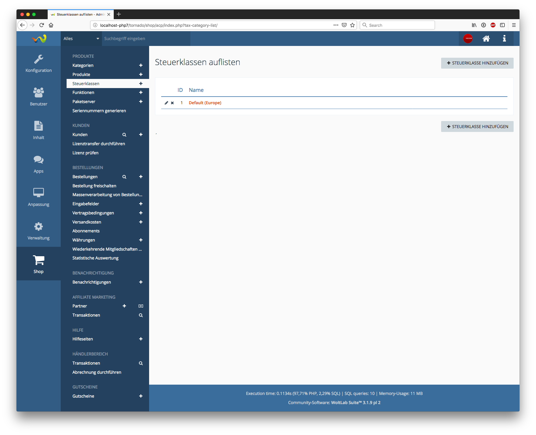 Die Umsatzsteuer wird über sogenannte Steuerklassen berechnet. Je nach Ihrer rechtlichen Begebenheit müssen Sie andere Einstellungen treffen. Die Konfiguration erfolgt über das ACP unter Shop > Produkte > Steuerklassen. Standardmäßig ist bereits eine Steuerklasse für die Verrechnung digitaler Leistungen innerhalb der Europäischen Union konfiguriert. Einer Steuerklasse hat einen Steuersatz, welcher grundsätzlich für alle Länder gilt. Zusätzlich kann dieser Steuersatz pro Land übersteuert werden. Weiters kann eine Option aktiviert werden, dass keine Umsatzsteuer ausgewiesen werden soll.