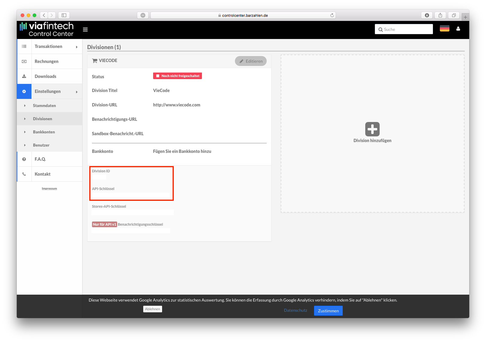 Um die Zahlungsanbindung zu aktivieren, müssen Sie im Feld Devision ID und API-Schlüssel Ihre Daten von Barzahlen/viacash hinterlegen. Sie finden diese Daten im Barzahlen/viacash Control Center. Klicken Sie auf Einstellungen und anschließend auf Divisionen. Unsere Implementierung verwendet die JSON-basierende Implementierung der Zahlungsschnittstelle (V2).