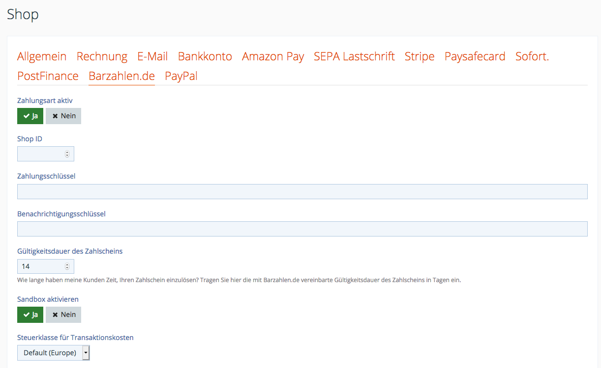 Verwenden Sie die Option Sandbox aktivieren, um die Zahlungsanbindung im Sandbox-Modus zu testen. Beachten Sie bitte, dass Sie die entsprechenden Sandbox-Schlüssel verwenden müssen.