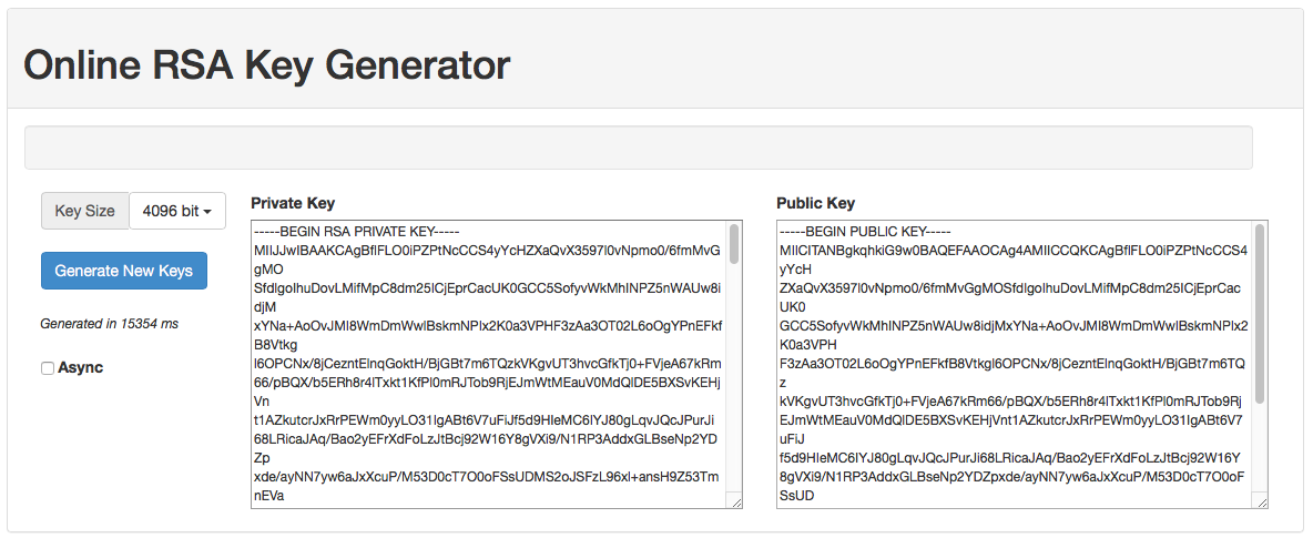 Der einfachste (wenn auch nicht sicherste Weg) ist die Generierung über einen kostenlosen Online-Service wie JSCrypt. Wählen Sie hier eine Key Size von 4096 bit aus und klicken anschließen auf Generate New Keys.