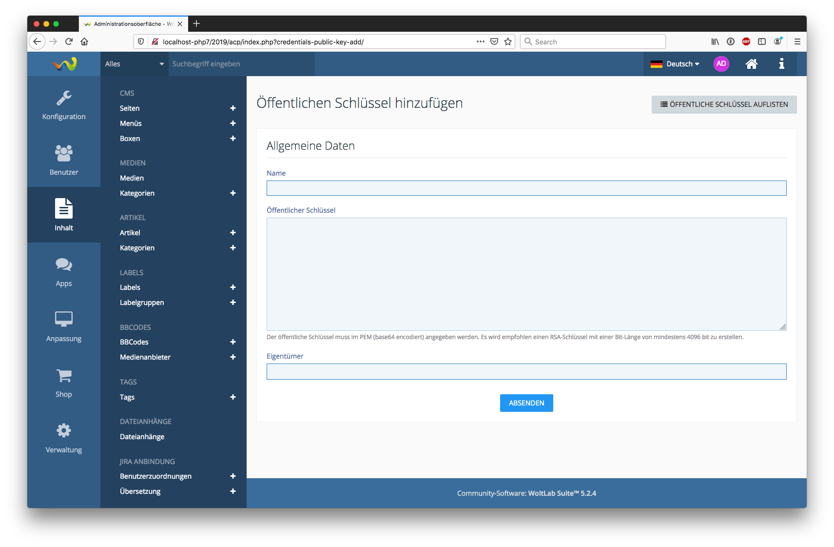 Dieses Schlüsselpaar muss nach der Installation erstellt werden. Es gibt dafür mehrere Möglichkeiten. Es wird ein RSA Schlüssel im PEM-Format (base64-kodiert) mit einer empfohlenen Schlüssellänge von 4096 bit benötigt.