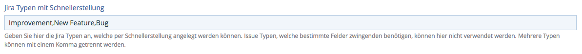 Anschließend muss in den Einstellungen unter ACP > Konfiguration > Optionen > Jira Anbindung > Individualisierung > Jira Typen mit Schnellerstellung hinterlegt werden, welche Typen diese Art der Erstellung unterstützen.