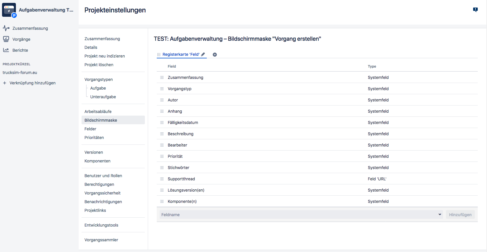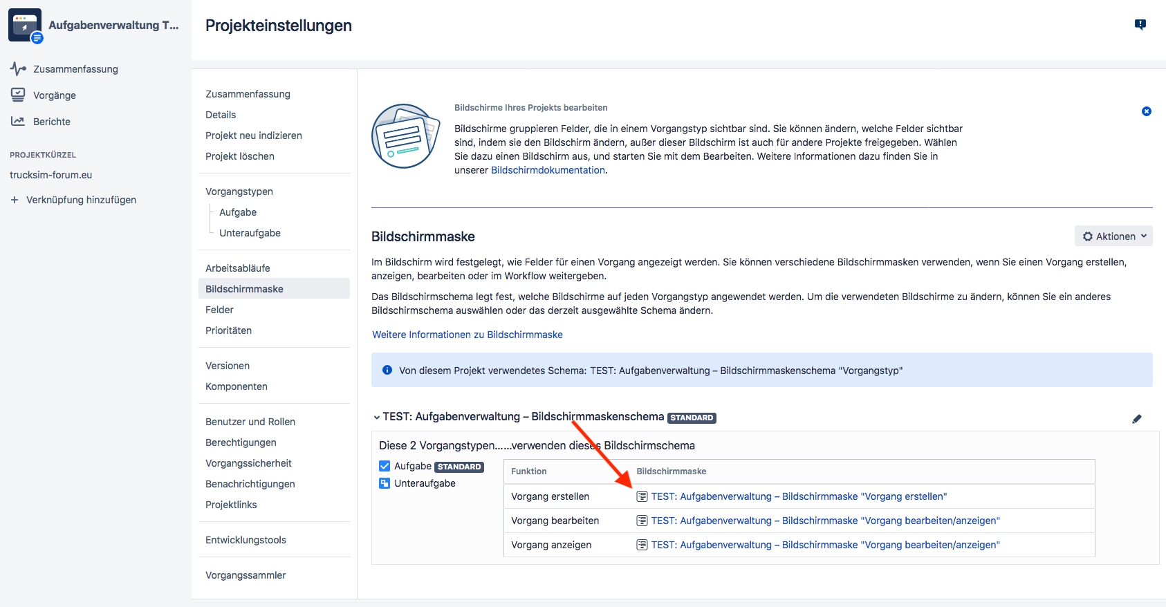 Sie können entweder diesen Typ in den Einstellungen entfernen oder die Bildschirmmaske entsprechenden konfigurieren. Öffnen Sie dafür das Projekt in JIra und klicken auf die Projekteinstellungen in der linken unteren Ecke.