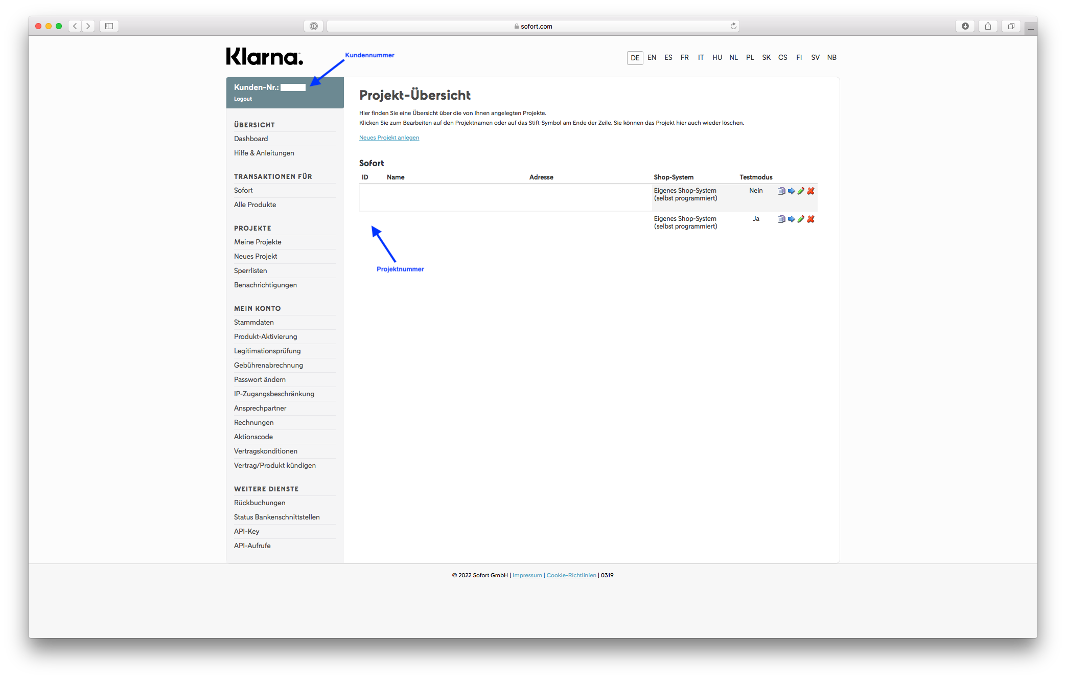Über die Seite https://www.sofort.com/payment/users/register muss zunächst ein Konto auf sofort.com angelegt werden. Um die Zahlungsanbindung zu aktivieren, müssen Sie im Feld Kundennummer, Projektnummer, Hash-Algorithmus, Projekt-Passwort und Benachrichtigungspasswort Ihre Daten von Sofort hinterlegen. Sie finden diese Daten im Verkäuferbereich (Dashboard) von Sofort. Klicken Sie dazu in der Navigation auf Meine Projekte und anschließend auf das gewünschte Projekt. Auf der Übersichtsseite finden Sie Ihre Kundennummer und die Projektnummer.