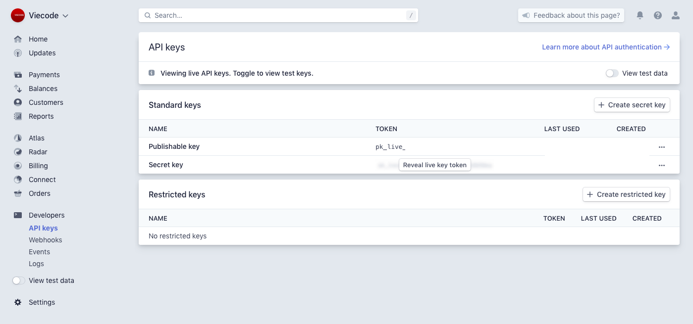 Auf dieser Seite finden Sie ihren benötigten Schlüssel. Tragen Sie den Token unter Publishable key im Feld öffentlicher Schlüssel ein. Klicken Sie anschließend auf Reveal live key token und Sie diesen Wert im Feld Privater Schlüssel ein. Sollten Sie den Sandbox/Testmodus im ACP aktiviert haben, müssen Sie die Schlüssel verwenden, die test beinhalten. Für die Produktivumgebung verwenden Sie die live Schlüssel.