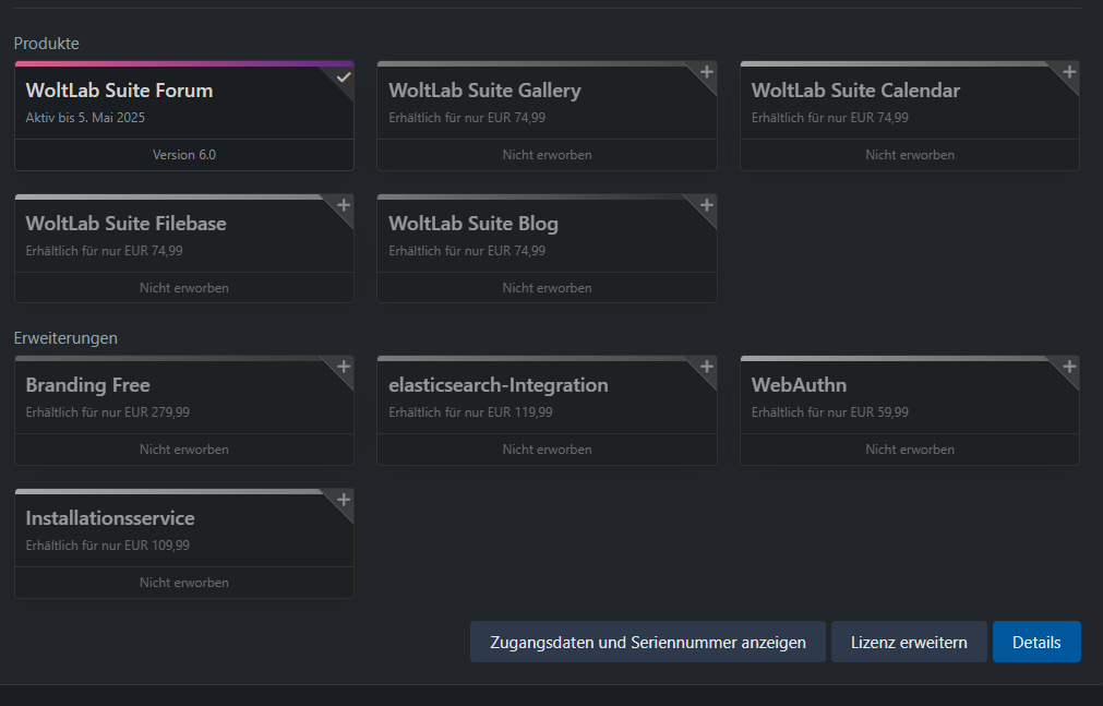 Die WoltLab Suite 6.0 Forum Lizenz ist noch bis zum 5. Mai 2025 gültig. Die Lizenz wird an ein gewünschtes Konto übertragen. Die Kosten hierfür sind im Preis inklusive.