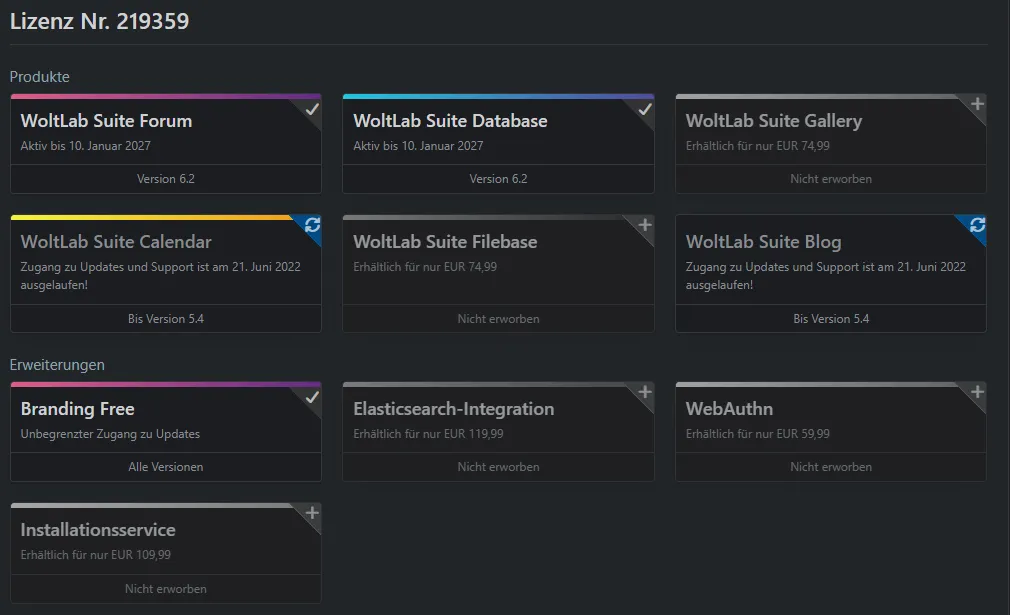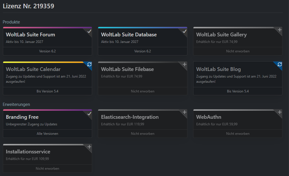 Es wird die Lizenz übertragen, kein Account übergeben.Zahlen kann man per PayPal oder per ÜberweisungBei Interesse oder Fragen gerne melden. Lizenzdaten Enthaltene Produkte WoltLab Burning Board Enthaltene Erweiterungen Branding Free WSC (WoltLab Suite Core) Generation WSC 6.2 VHB