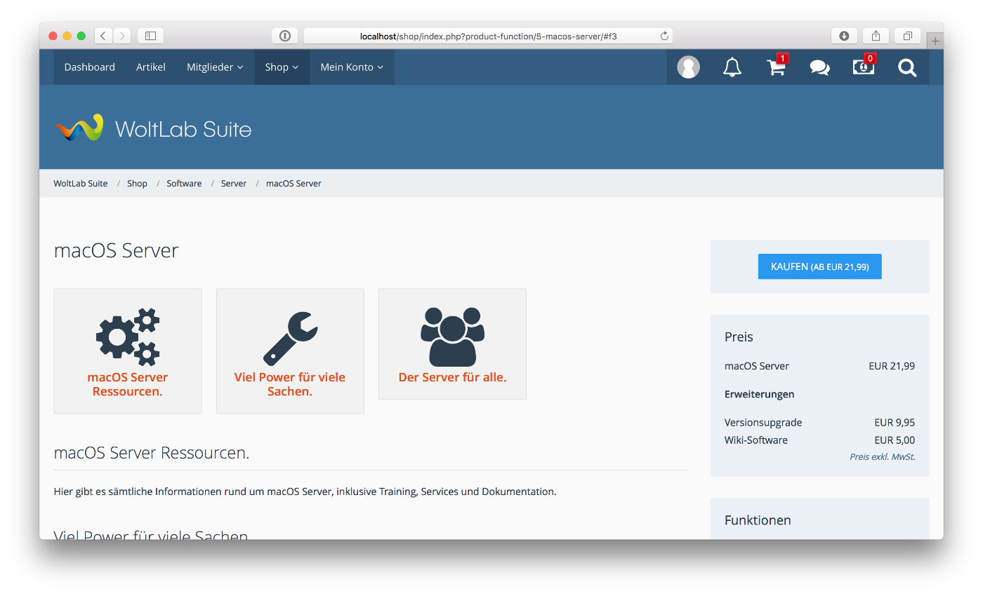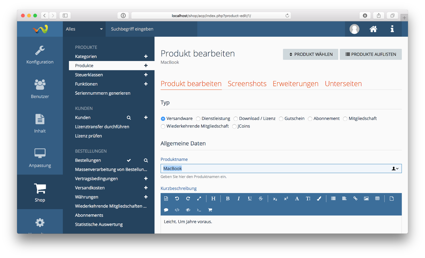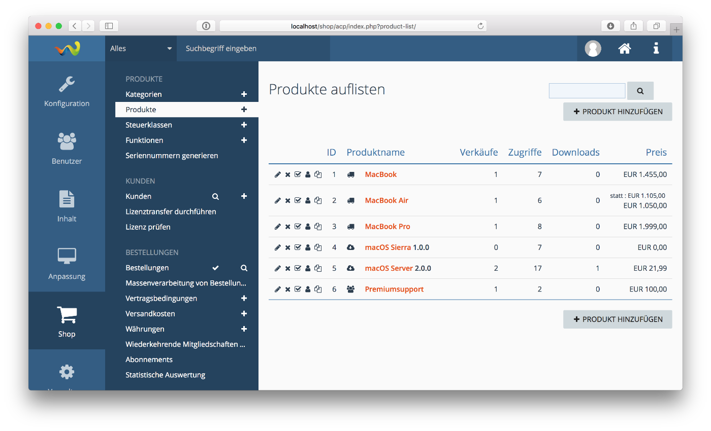 Sie wollen Software, Downloads oder Produkte über Ihre WSC-basierte Webseite verkaufen bzw. vertreiben? Unsere Shop-Lösung bietet Ihnen die dazu passende Möglichkeit an. Sie können den Shop sowohl als Präsentationsseite Ihrer freien Produkte (inkl. Downloadmöglichkeit direkt auf der Produktseite), als auch zum Verkauf von virtuellen (Software, Lizenzen, Downloads, etc.) oder realen Gütern nutzen. Die Bezahlung ist direkt in die Produktseite integriert und kann über Schnittstellen durch weitere Zahlungsarten erweitert werden. Der Kunde erhält nach der Freischaltung der Zahlung die Zugangsdaten für den Kundenbereich. Im Kundenbereich kann der Kunde vorhandene Lizenzen einsehen, verlängern bzw. erweitern und gekaufte Produkte herunterladen. Über die integrierte Administrationsoberfläche können alle Produkte und Kundenkonten bequem verwaltet werden.