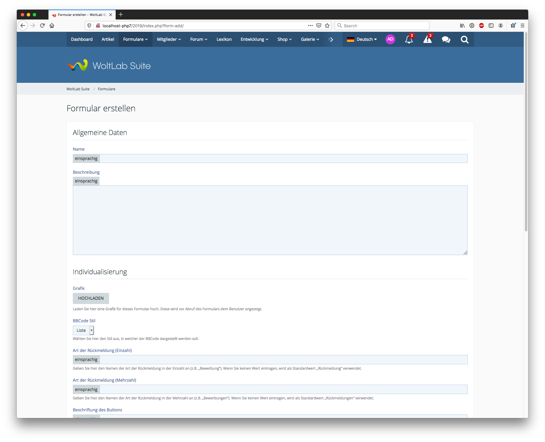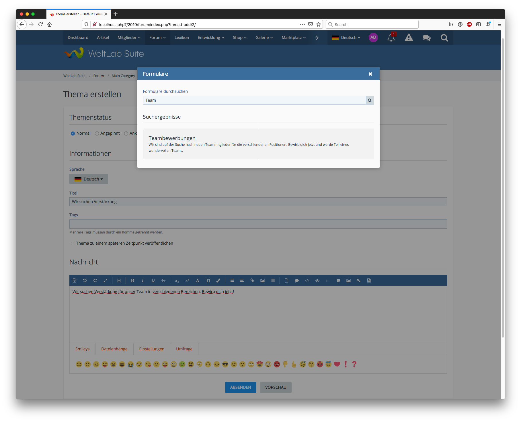 Das WSC besitzt ein sehr mächtiges CMS und Framework. Es gibt aber einen großen Schwachpunkt: Die Erfassung von individuellen Daten ist sehr schwierig. Ohne Programmierkenntnisse kann man keine individuellen Formulare erstellen. Oft hat man sich mit individuellen Themenformularen oder anderen Plugins geholfen. Das Grundproblem ist damit aber unserer Ansicht nach nicht gelöst. Wir haben öfters Anfragen über individuelle Lösungen erhalten, wo uns Kunden gebeten haben, ein Formular für den jeweiligen Anwendungsfall zu bauen. Unser neues Produkt löst genau dieses Problem und ermöglicht die Erstellung von komplett individualisierbaren Formularen. Die Umsetzung erfolgt über einen speziellen BBCode, der sowohl in Endwendungen wie dem Forum, aber auch im CMS in Boxen oder Seiten benutzt werde kann. Alternativ gibt es auch eine eigene Seite pro Formular, die entsprechend verlinkt werden kann.