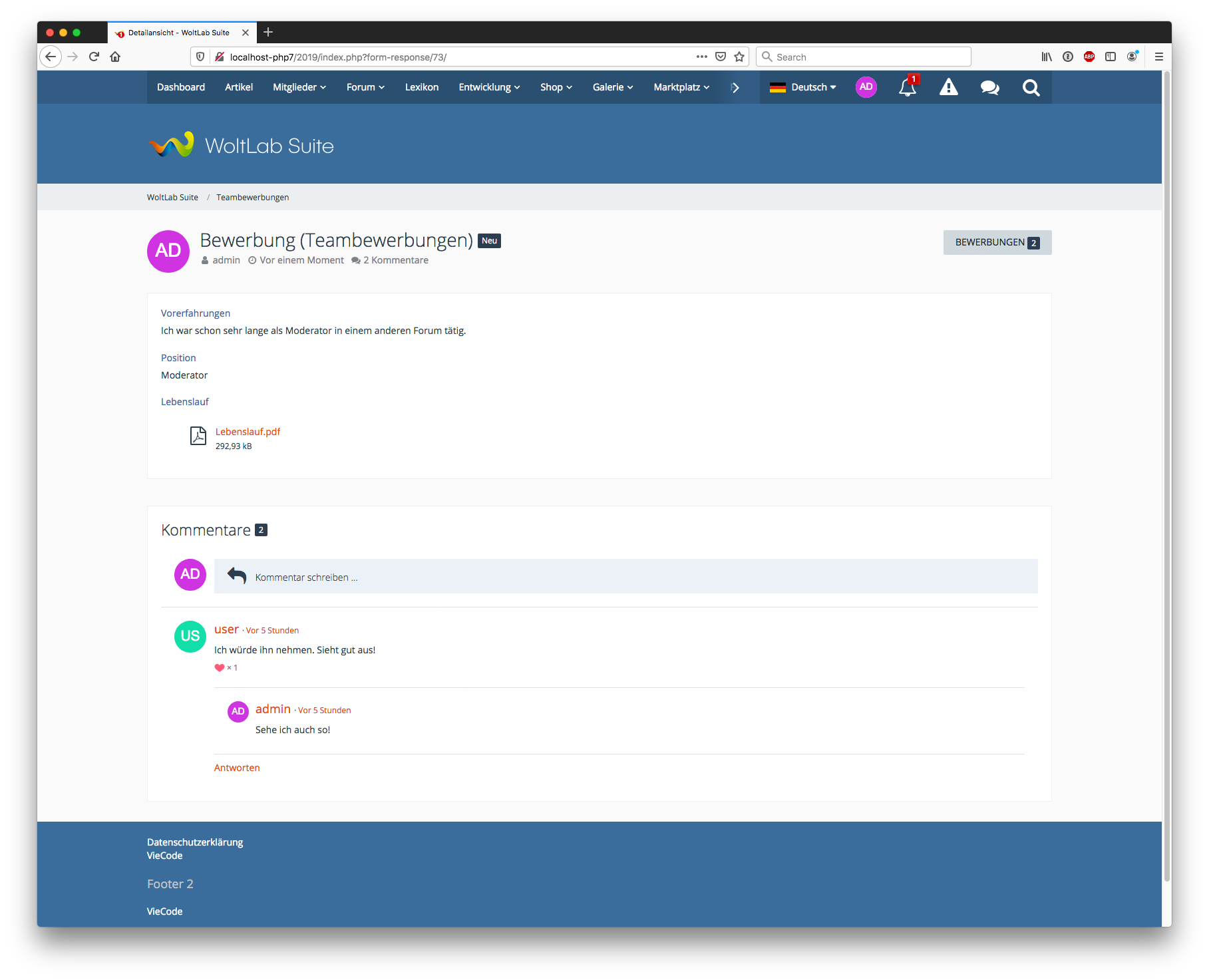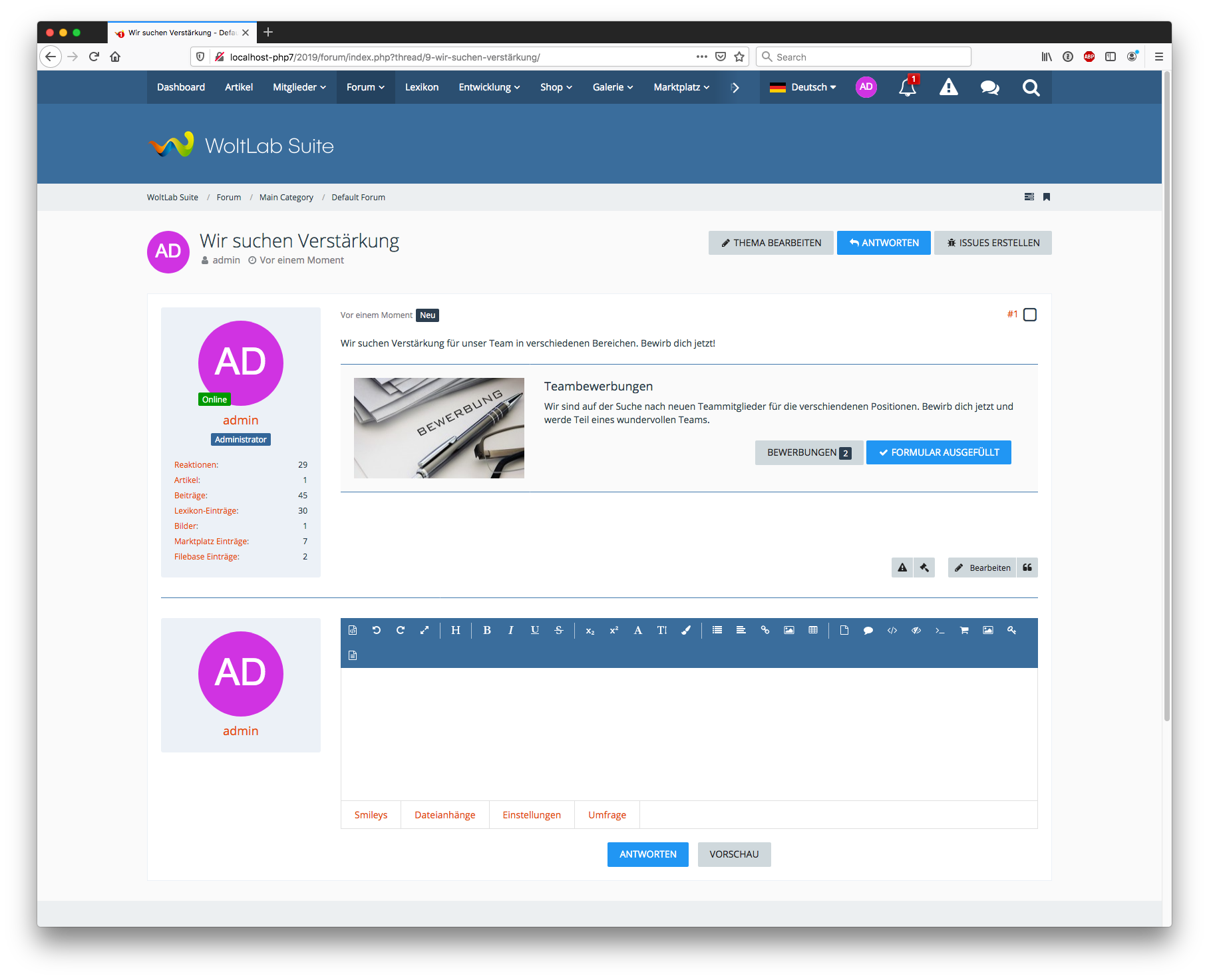 - Es wird automatisch ein neues Thema im Teambereich erstellt, wenn sich ein Benutzer über ein Formular für eine Position bewirbt.