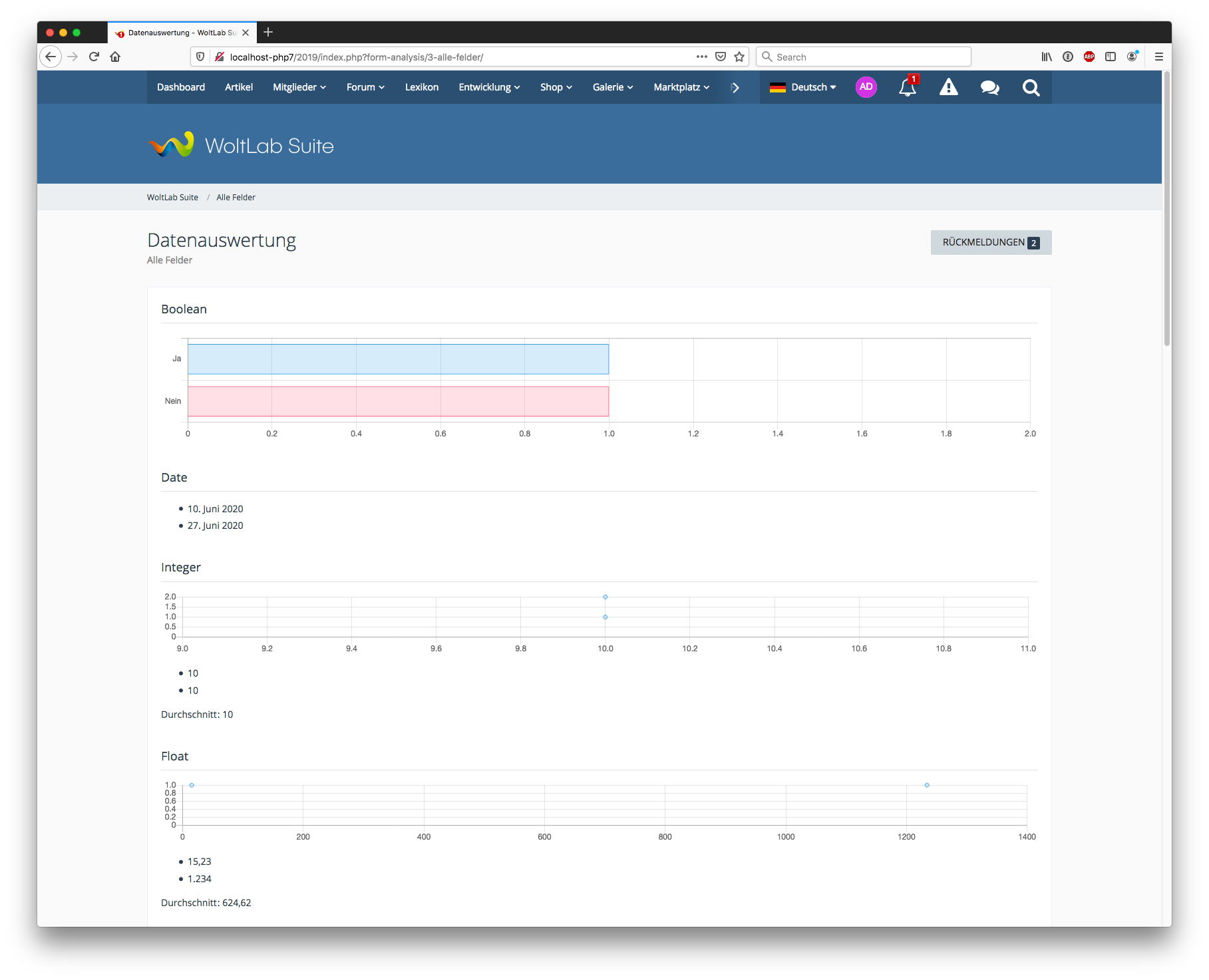 Wir haben sehr viel Zeit in die Auswertung investiert. Die Rückmeldungen können sowohl individuell als auch statistisch betrachtet werden. Zusätzlich speichern wir, welche Einträge bereits gelesen wurden, d.h. man hat auch einen guten Überblick über neue Rückmeldungen. Alle Rückmeldungen können in viele gängige Formate exportiert werden. Auch eine Liste mit selektierten Einträgen und aus unterschiedlichen Formularen ist möglich. Die Auswertung erfolgt dabei direkt auf dem Frontend.