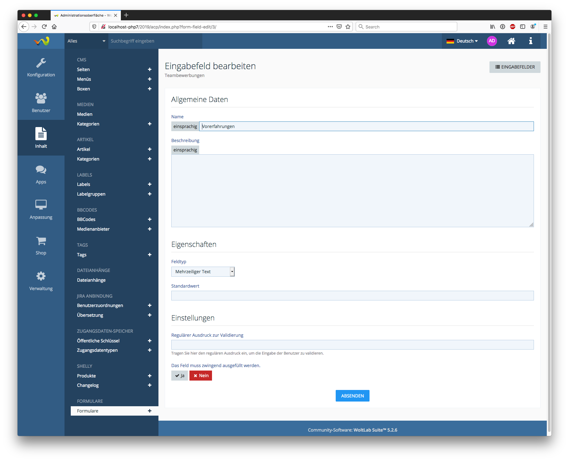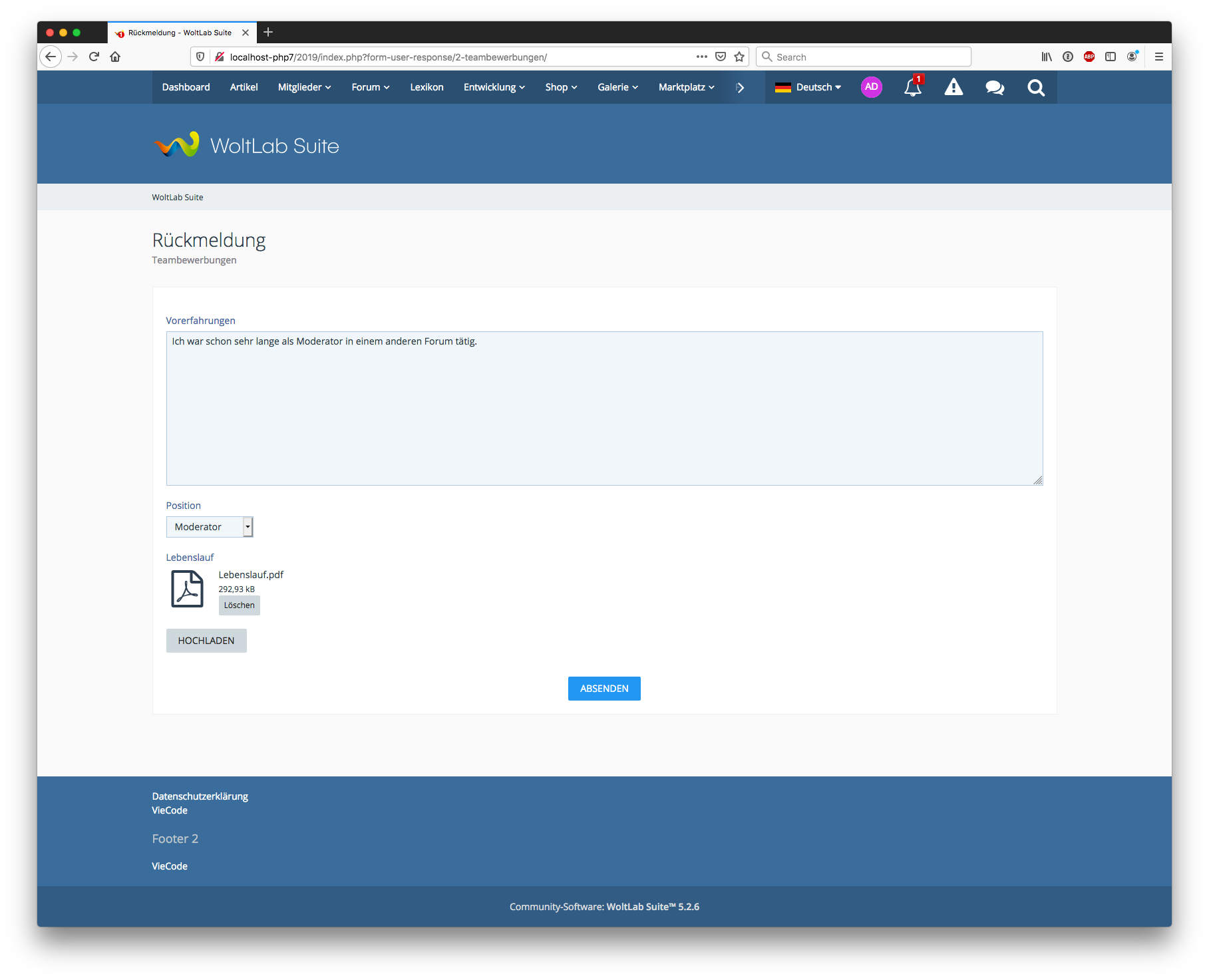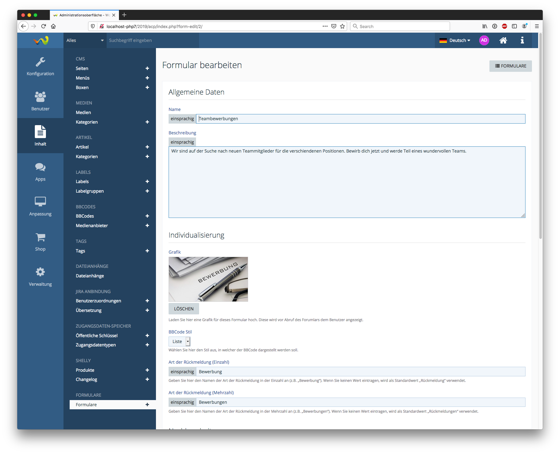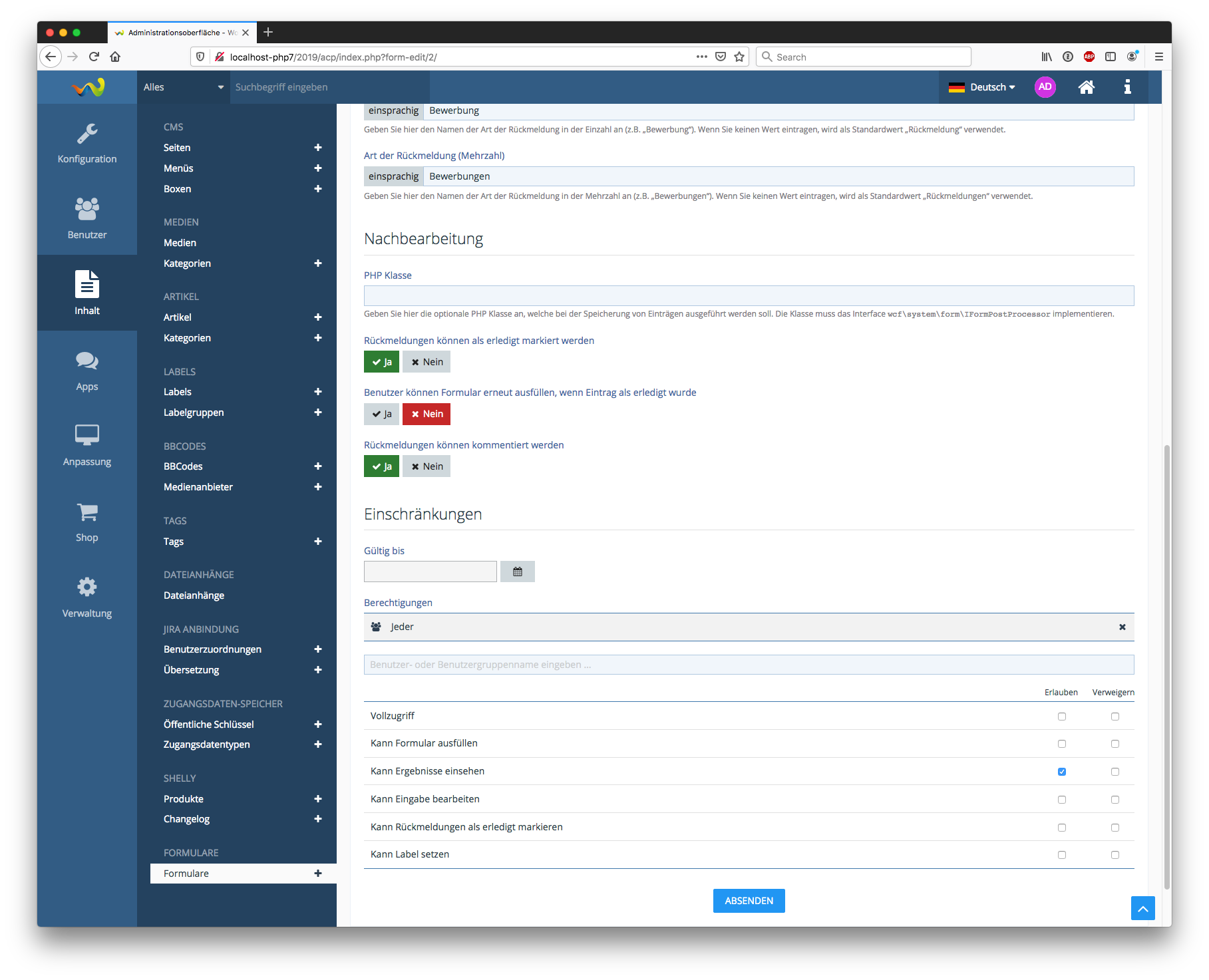 Das Formular kann dabei durch den Administrator individuell zusammengebaut werden. Zusätzlich sind Einschränkungen der Rechte auf einzelne Benutzer oder Benutzergruppen möglich. Die Anwendungsmöglichkeiten sind dabei unbegrenzt. Von Anmeldungen zu einem Event, Bewerbungen für Teampositionen bis hin zu Umfragen ist alles möglich. Das Formular unterstützt Antworten vom Typ Ja/Nein, Datum, Ganze Zahl, Dezimalzahl, Auswahlliste (Einfach- oder Mehrfachauswahl), einzeiliger und mehrzeiliger Text, HTML (mit WYSIWYG Editor), URL und Dateiupload.