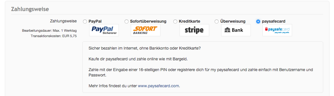 Paysafecard gibt es als Zahlungsmethode hier im Shop.