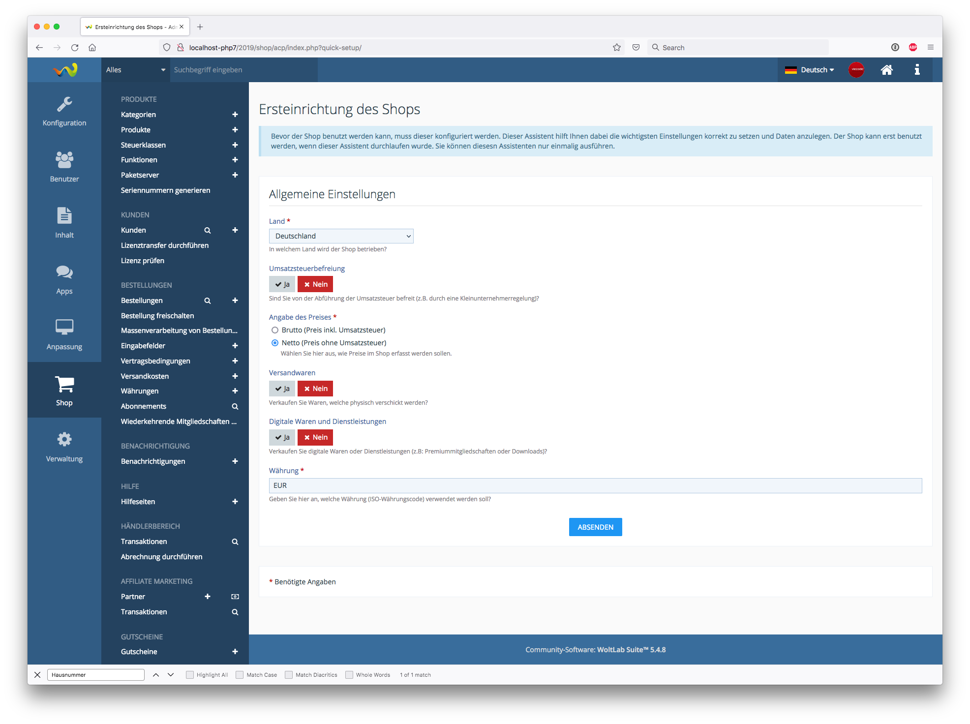Durch die enorme Flexibilität des VieCode Shops und die unterschiedlichsten rechtlichen Gegebenheiten (Kleinunternehmer, USt., Versand, etc.), kann die Ersteinrichtung manchmal schwer fallen. Nach der Installation wird nun automatisch ein Einrichtungsassistent anzeigt, welchen den Betreiber bei der richtigen Konfiguration unterstützen soll. Durch die Beantwortung von wenigen Fragen wird der Shop richtig konfiguriert und ist nun noch schneller einsatzbereit.