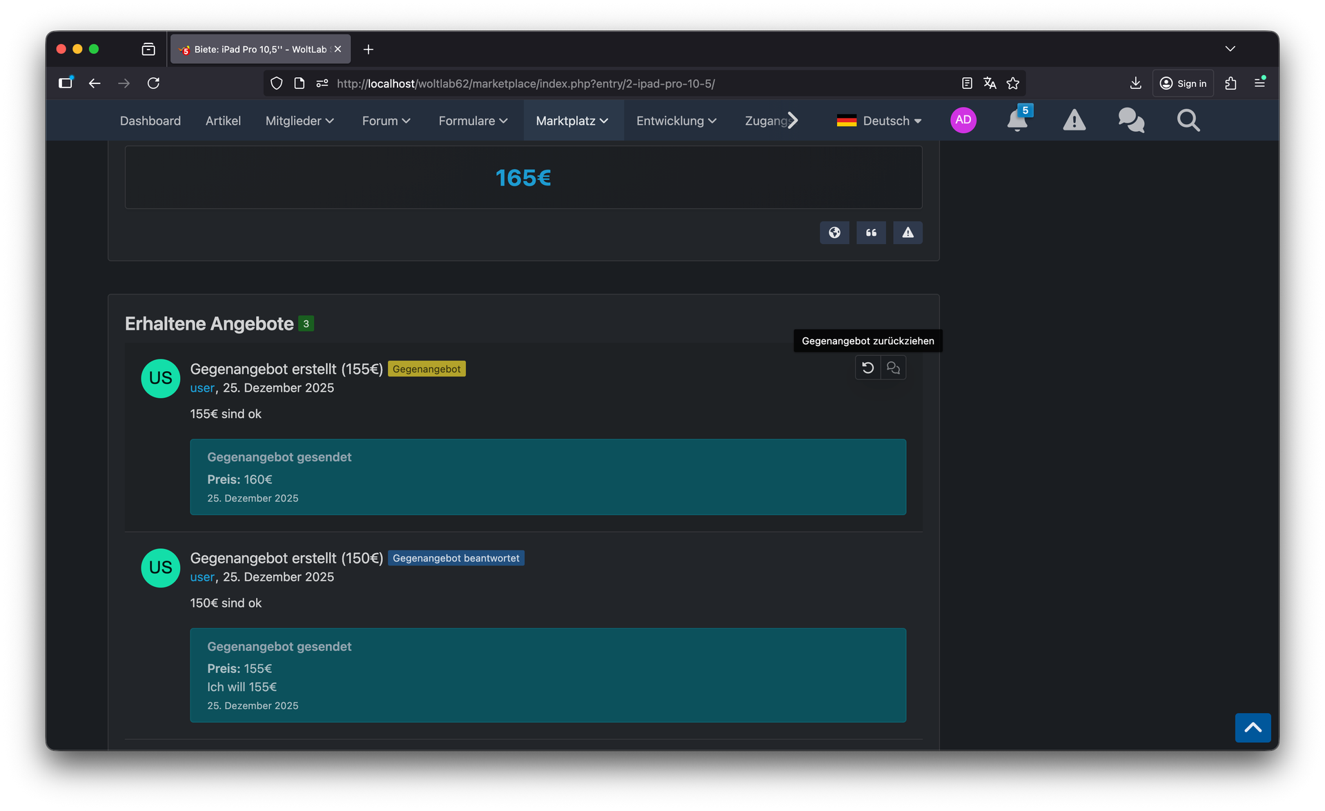Nutzer können nun Angebote zurückziehen, wenn sie sich umentschieden haben oder das Produkt anderweitig verkauft wurde. Diese Funktion sorgt für mehr Flexibilität und hält den Marktplatz aktuell und übersichtlich. Zusätzlich lassen sich Angebote als reserviert markieren, um anderen Nutzern zu signalisieren, dass das Produkt bereits für einen Interessenten zurückgelegt wurde – ideal für die Phase zwischen Zusage und finaler Abwicklung.