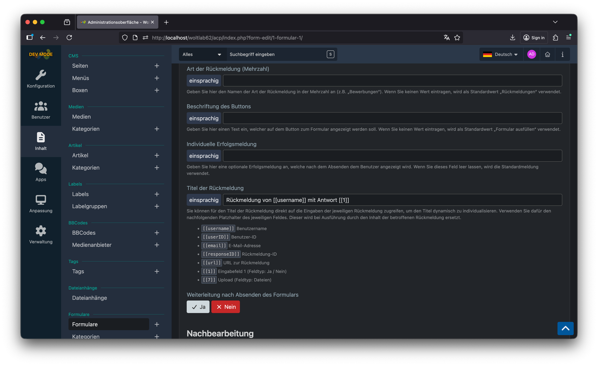 Mit dem individuellen Titel für Rückmeldungen können Sie die Bezeichnung von Formulareinsendungen an Ihre Bedürfnisse anpassen. Statt generischer Begriffe verwenden Sie präzise Benennungen wie "Bewerbung", "Support-Ticket" oder "Bestellung". Die individuelle URL-Funktion ermöglicht es Ihnen, sprechende und SEO-freundliche URLs für Ihre Formulare zu definieren. Statt kryptischer Zahlenfolgen nutzen Sie aussagekräftige Adressen, die leichter zu merken und zu teilen sind. Auch Werte aus Eingaben können im Titel verwendet werden.