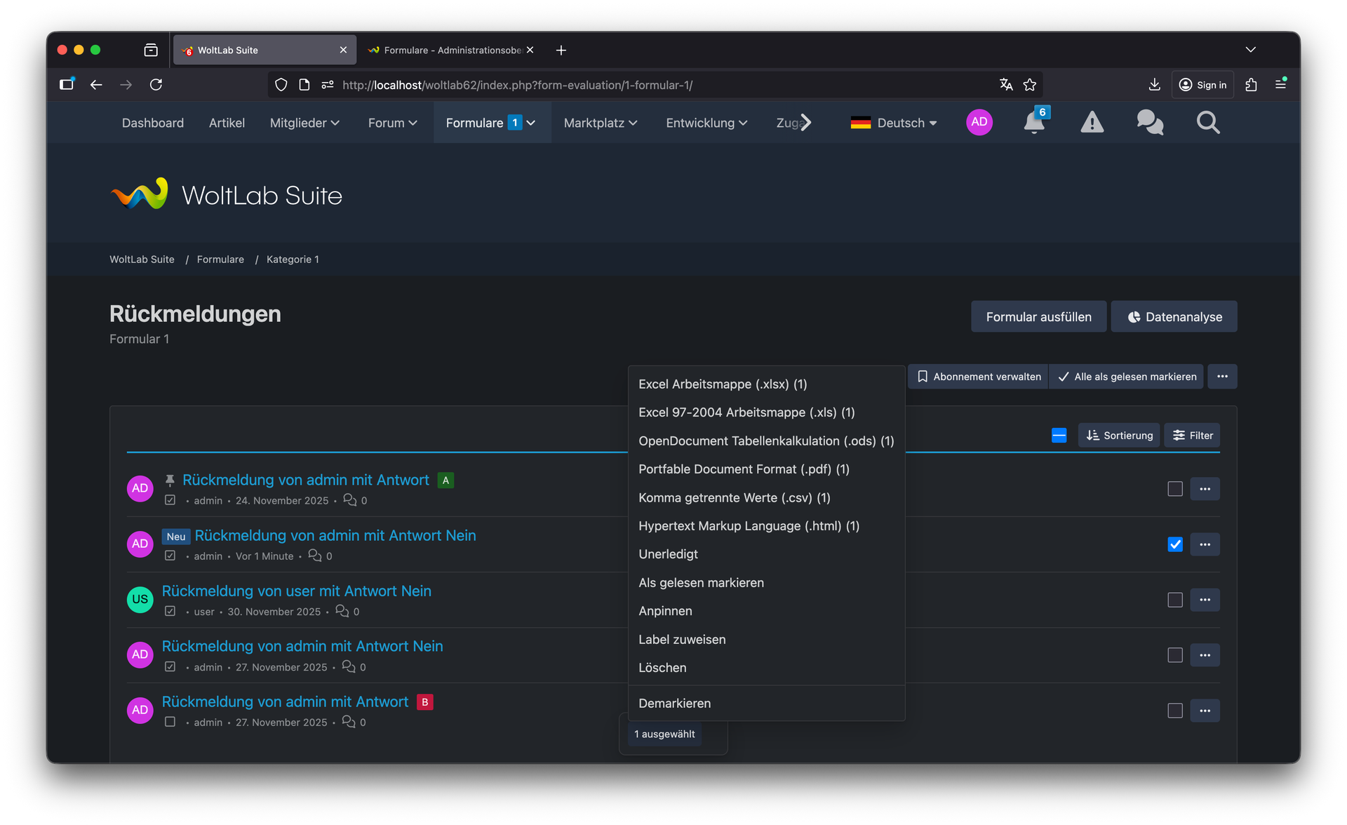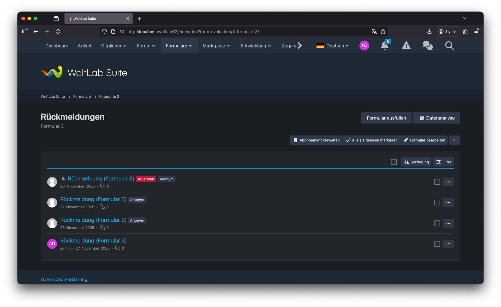 Die Sortierfunktion für Formulare ermöglicht es Ihnen, Ihre Formulare nach Wichtigkeit, alphabetisch oder nach anderen Kriterien zu ordnen – für bessere Übersichtlichkeit bei vielen Formularen. Mit der Funktion "Alle Rückmeldungen als gelesen markieren" sparen Sie Zeit bei der Verwaltung großer Mengen von Einsendungen. Ein Klick genügt, um den Überblick zurückzugewinnen. Die Bearbeitungsfunktion in der Detailansicht ermöglicht schnelle Anpassungen direkt beim Betrachten einer Rückmeldung – effizienter Workflow ohne Seitenwechsel.