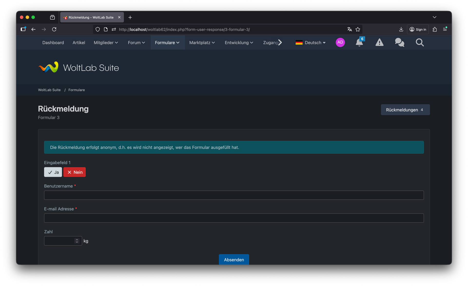 Die Anzeige, dass ein Formular bereits ausgefüllt wurde, verhindert Doppeleinsendungen und informiert Nutzer transparent über den Status ihrer Teilnahme. Besonders nützlich bei Umfragen, Registrierungen oder Bewerbungsformularen. Das Suffix für Eingabefelder ermöglicht die Anzeige von Einheiten oder Hinweisen direkt neben dem Eingabefeld (z.B. "€", "kg", "Zeichen verbleibend"), was die Bedienung intuitiver macht. Mit individuellen Fehlermeldungen für ungültige Eingaben geben Sie Nutzern präzises Feedback, was genau korrigiert werden muss – keine generischen Meldungen mehr, sondern hilfreiche, kontextbezogene Hinweise.