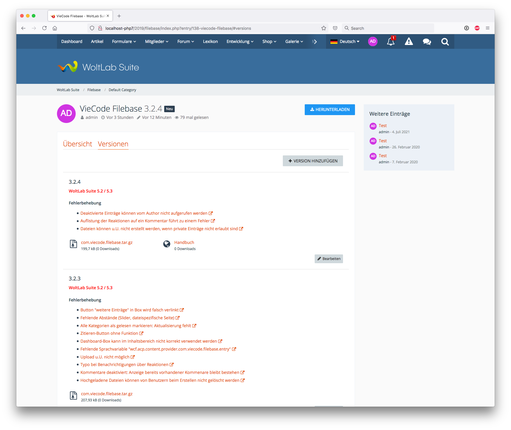 Dateien werden nun einer Versionsnummer zugeordnet. Diese können zusätzlich eine Beschreibung / Changelog besitzen. Die Versionen werden dabei übersichtlich in einem weiteren Tab direkt im Eintrag angezeigt. Jede Version kann mehrere Dateien einhalten (z.B. die jeweilige Softwaredatei und ein Handbuch). Es werden wie gewohnt auch externe Dateien unterstützt.