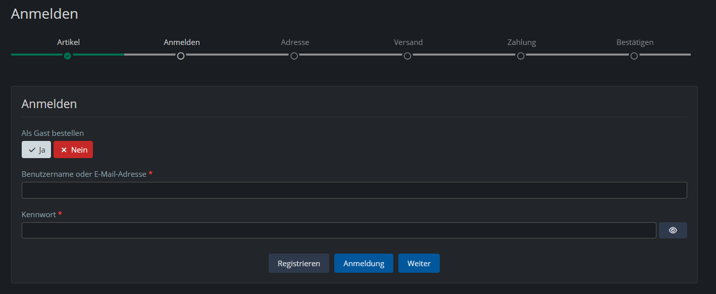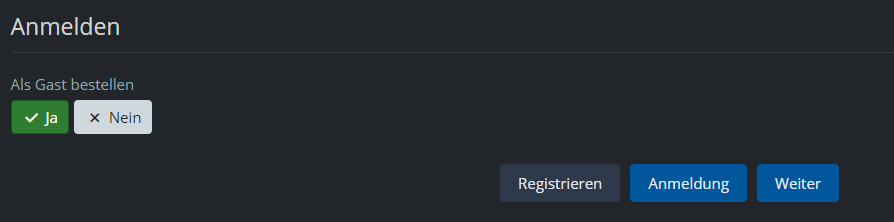 Wenn ich Als Gast bestellen = Ja auswähle, bleiben die Buttons Registrieren und Anmeldung weiterhin vorhanden, wieso? Wäre es nicht sinnvoll, das Boolean-Feld generell weg zu lassen und Als Gast bestellen als Button einzufügen?